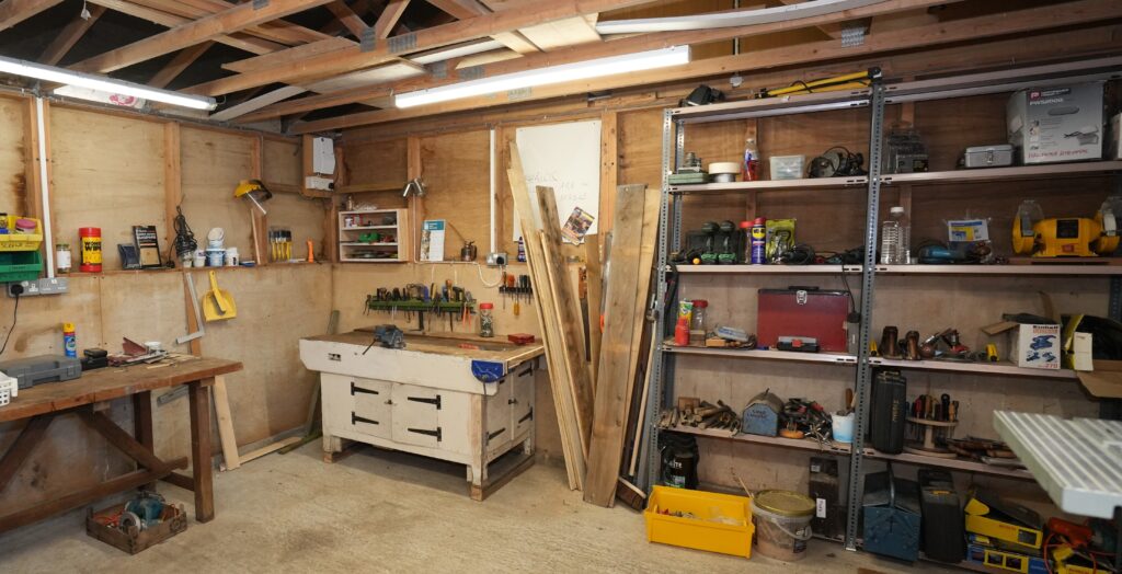 Here Shedders carry out woodworking, metalworking and many other similar tasks such as sawing, planing, drilling and grinding. The room has three benches and a bandsaw, pillar drill and bench grinder plus a wide selection of power tools and hand tools