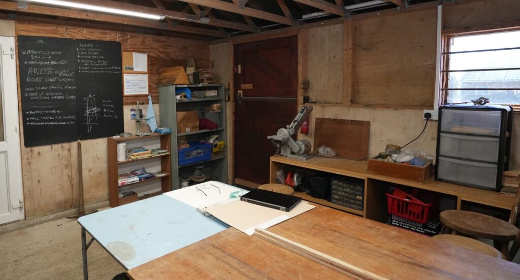 This room is used for cutting, turning, sanding etc and houses a woodworking lathe, table saw, bandsaw & sliding mitre saw